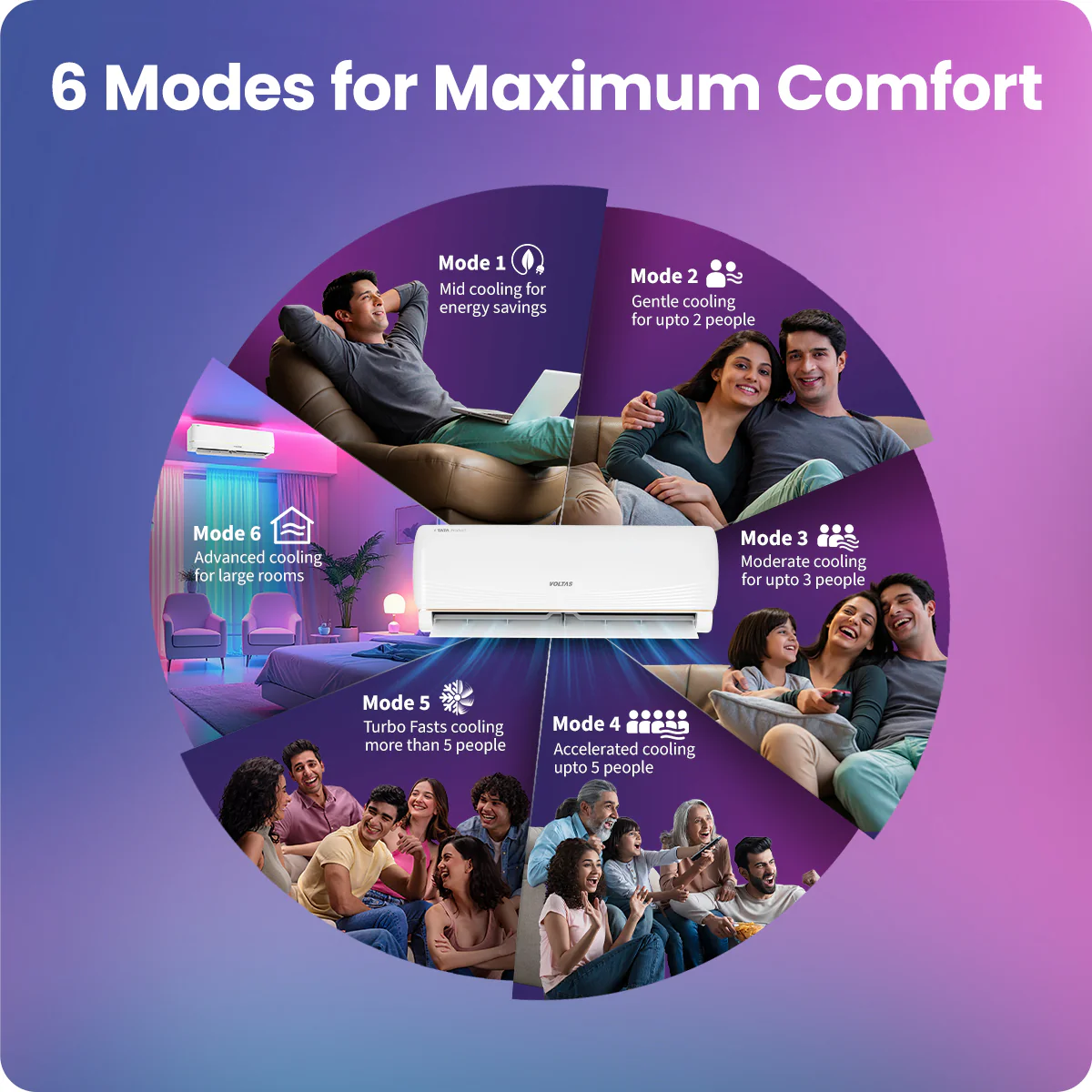 Meet the Voltas Vertis AI Zest Gold 1.5 Ton 3 Star Inverter Split Room AC your smarter, intuitive cooling partner. Powered by Smart AI RAC, it learns your usage patterns and adjusts cooling automatically for optimum comfort. With AI Adaptive Cooling, it senses room conditions and sets the ideal temperature without manual input. The Geo‑Fencing feature allows the AC to switch modes or turn on/off based on your proximity, giving you a hands‑free experience every time you arrive or leave home. Control your energy use better with the Energy Manager, and fine‑tune cooling with 6 Step Adjustable Mode, matching real‑time room load for efficiency.