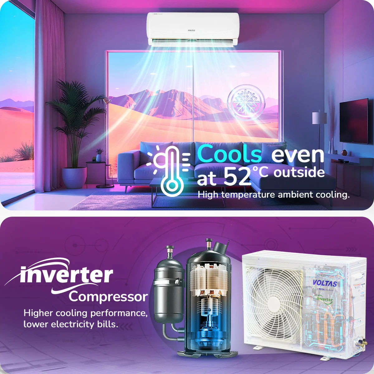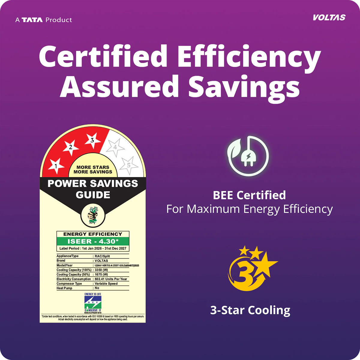 Voltas Split Air Conditioner, 1 Ton, 3 Star – 123INV Vertis AI Zest Gold