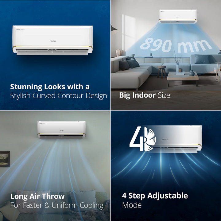 The Voltas Adjustable Inverter Split AC has a sleek curved design and a big indoor unit to ensure powerful airflow, Built to handle extreme 52°C temperatures, it keeps you cool, always.