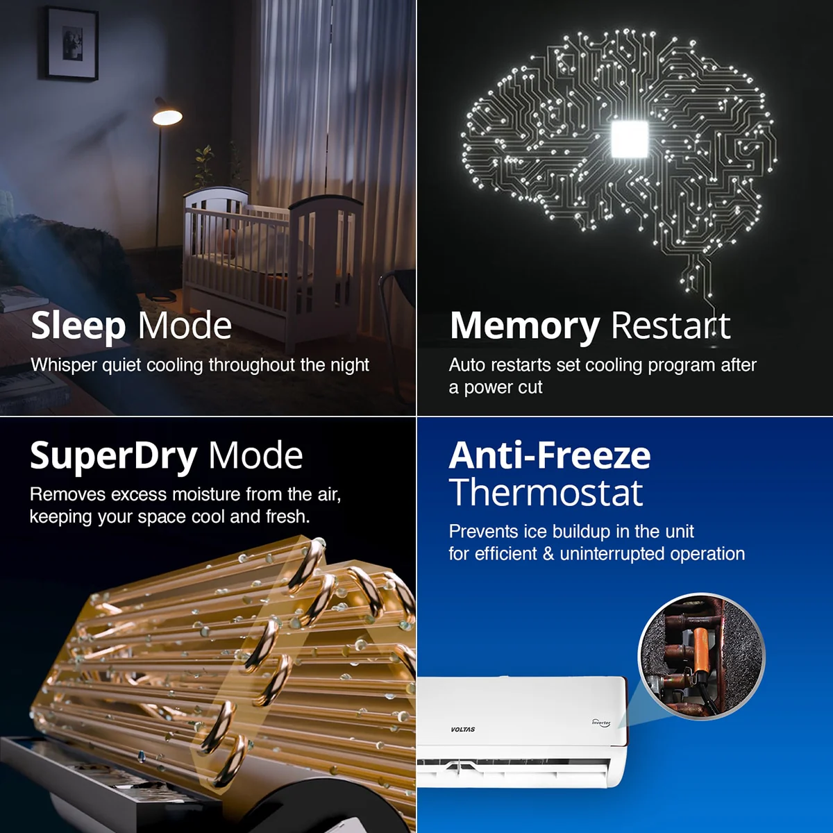 The Voltas Adjustable Inverter AC, is equipped with a unique Adjustable Mode. This innovative feature adapts tonnage according to temperature and occupancy, delivering comfort while effectively managing power consumption to reduce electricity costs. Experience comfort and savings with Voltas!