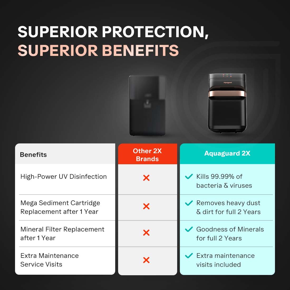 - Free Service Plan – Comes with Aquaguard genuine service plan offering free installation, 2 free cleaning service, and Unlimited Repair Visits* (*Valid for the first year only)