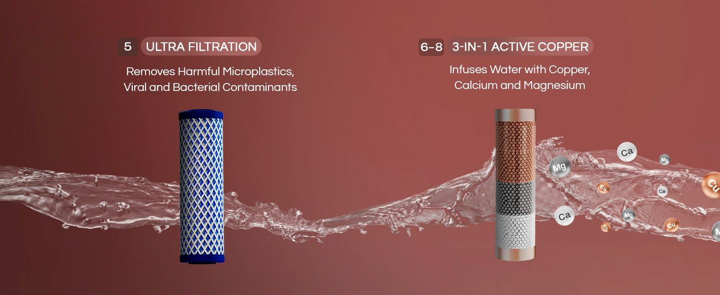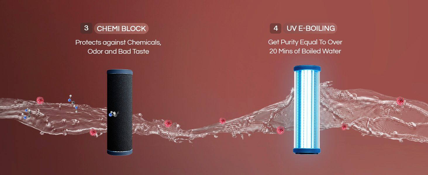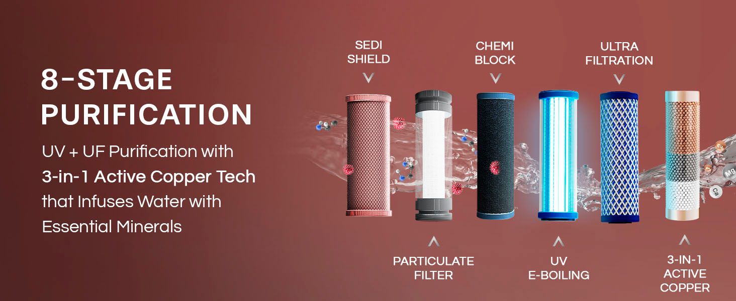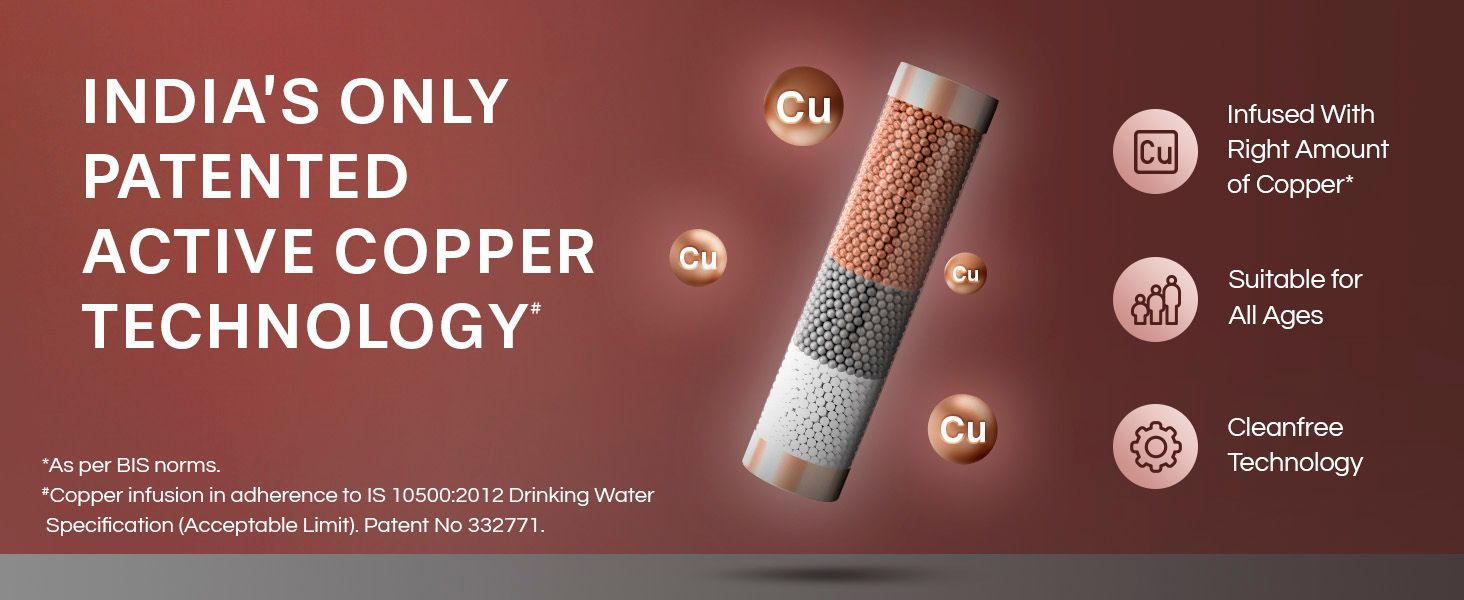 - Purification Modules : I-Filter, Chemi Block,Mineral Guard, UV e-boiling, Ultra filtration Active Copper Zinc Booster Cartridge