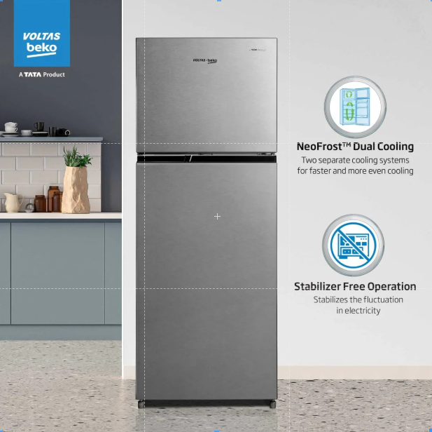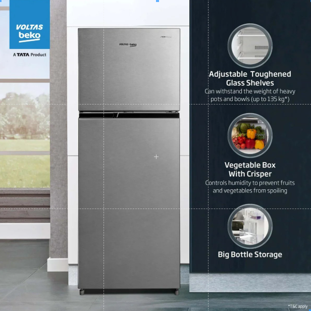 Voltas Beko 230L 3-Star Double Door Frost-Free Refrigerator (Brushed Silver) Product Details: